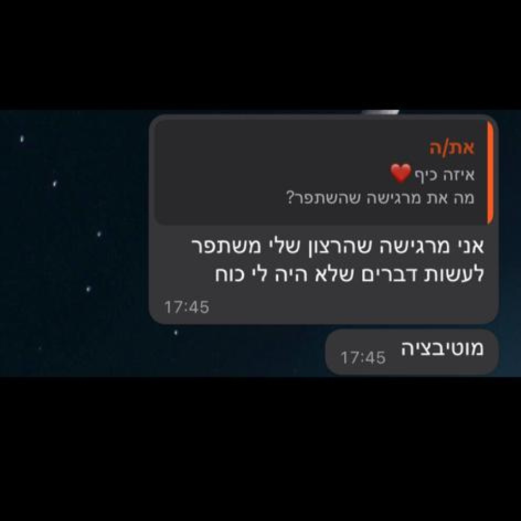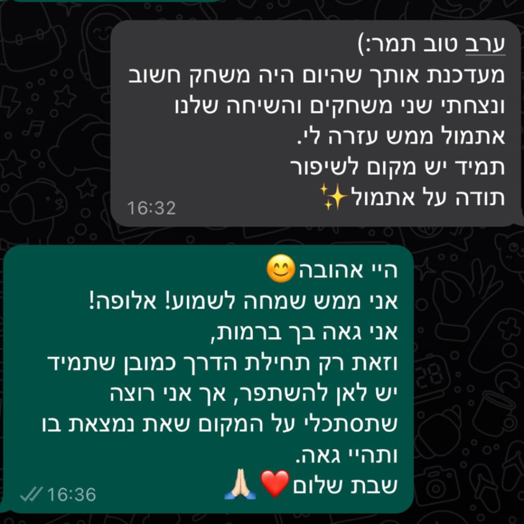 בדיוק בגלל זה, אני זמינה לך באופן קבוע בין הפגישות להתייעץ ולדבר כשאת צריכה הכוונה ועזרה. אני פה בשבילך בכל צעד בדרך למטרה.