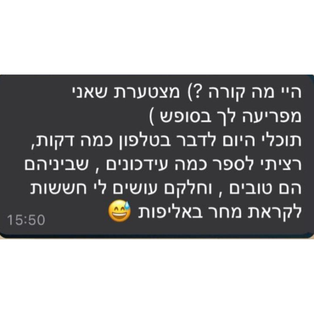 בדיוק בגלל זה, אני זמינה לך באופן קבוע בין הפגישות להתייעץ ולדבר כשאת צריכה הכוונה ועזרה. אני פה בשבילך בכל צעד בדרך למטרה.